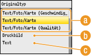 Sie können die optische Bildqualität für die Kopie abhängig vom Dokumententyp auswählen, wie zum Beispiel Nur-Text-Dokumente, Dokumente mit Diagrammen und Grafiken oder Zeitschriftenfotos.