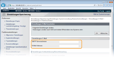 Verwenden Sie Remote UI zum Konfigurieren detaillierter E-Mail-Einstellungen wie der POP-vor-SMTP-Authentisierung und der SSL-Verschlüsselung. Weitere Informationen zu den erforderlichen Einstellungen erhalten Sie bei Ihrem Internetdienstanbieter oder Netzwerkadministrator.