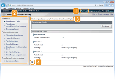 Zeigt die Seite [Einstellungen/Speicherung] an. Wenn Sie im Systemmanager-Modus angemeldet sind, können Sie die Einstellungen ändern und die gespeicherten Daten speichern bzw. laden.