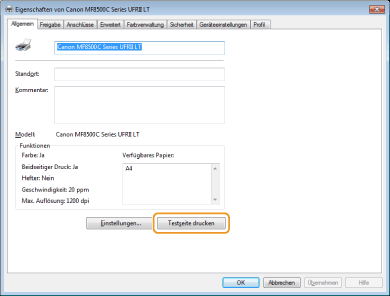 Klicken Sie auf [Testseite drucken], um eine Testseite zu drucken.